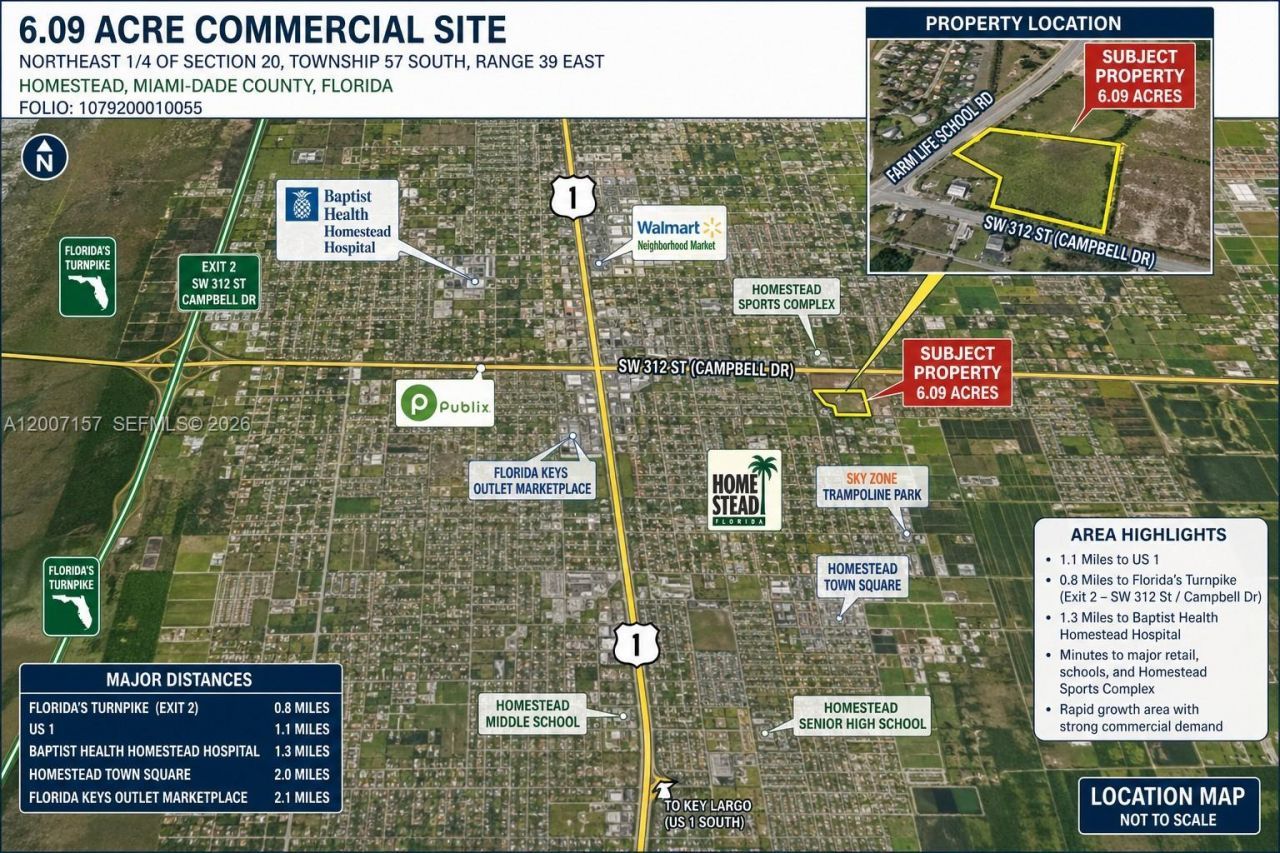Once-in-a-lifetime development opportunity in Homestead. Administratively approved for ±60-unit 55+ independent living community. Exceptional 6.09-acre corner parcel with dual frontage at S Canal Dr & SE 18 Ave, near Turnpike, US-1, retail, hospitals, and major amenities. Property includes extensive due diligence: traffic impact study and near-complete permit-ready plan sets (architectural, structural, civil, mechanical, electrical & plumbing). Geotechnical report completed with soil borings,...Once-in-a-lifetime development opportunity in Homestead. Administratively approved for ±60-unit 55+ independent living community. Exceptional 6.09-acre corner parcel with dual frontage at S Canal Dr & SE 18 Ave, near Turnpike, US-1, retail, hospitals, and major amenities. Property includes extensive due diligence: traffic impact study and near-complete permit-ready plan sets (architectural, structural, civil, mechanical, electrical & plumbing). Geotechnical report completed with soil borings, permeability test, and foundation recommendations, significantly reducing risk and development timeline. Flexible options include approved 55+ concept or townhouse development allowing density optimization. Rare, fully engineered development opportunity with strong development upside.
